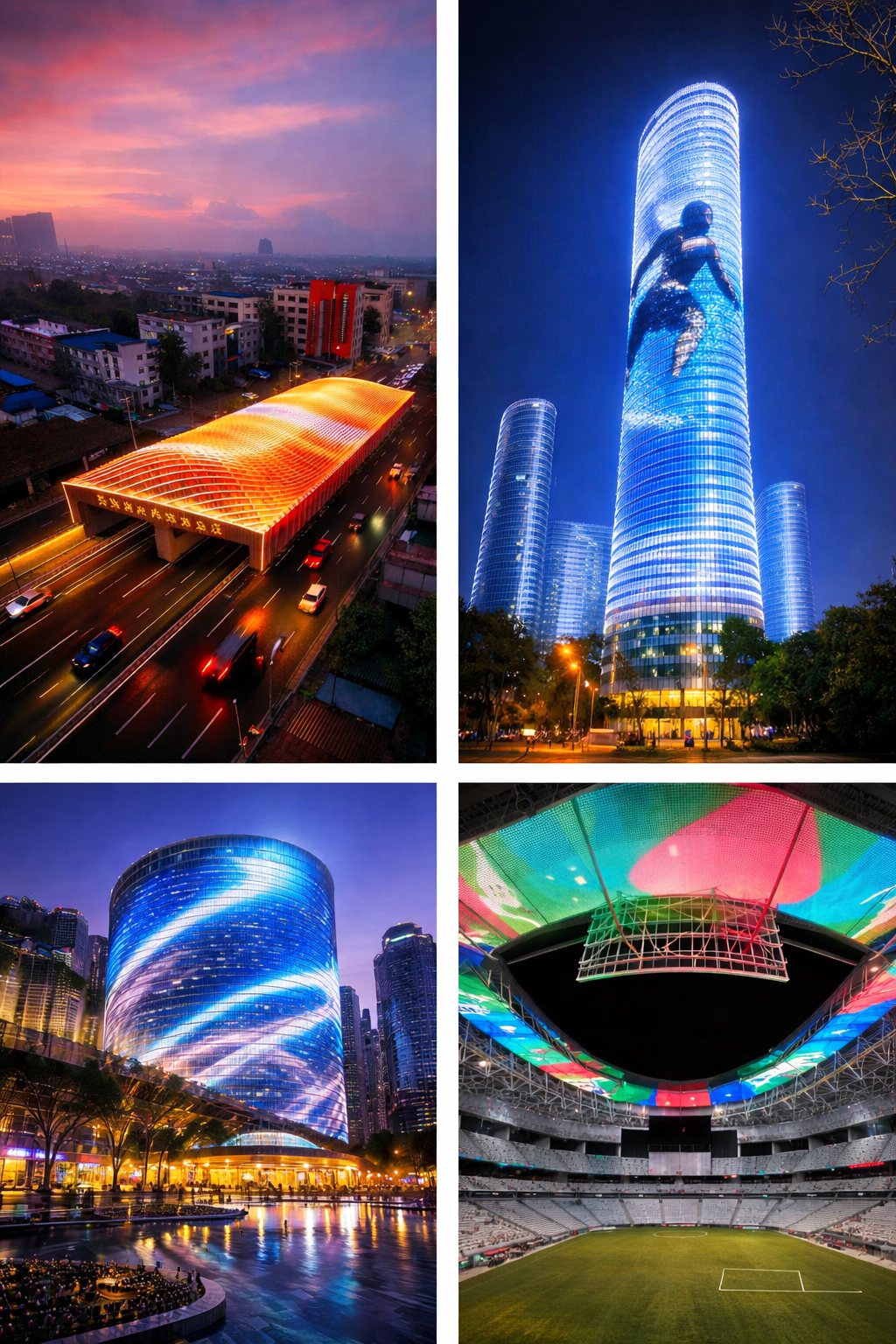 Because the system is modular, it can scale from feature sections to full-building media facades.